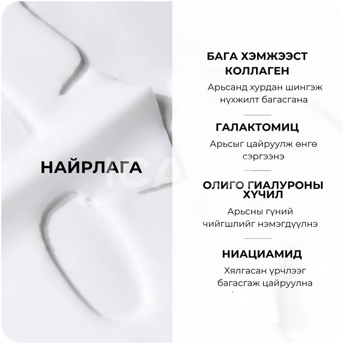Энэхүү коллаген нүүрний маск нь хоргүй, арьсыг загатнуулж цочроохгүй байх найрлагатай. Харшил үүсгэж, арьсыг эмзэгшүүлдэг 19 төрлийн найрлага ороогүй тул эмзэг арьсанд тохиромжтой.