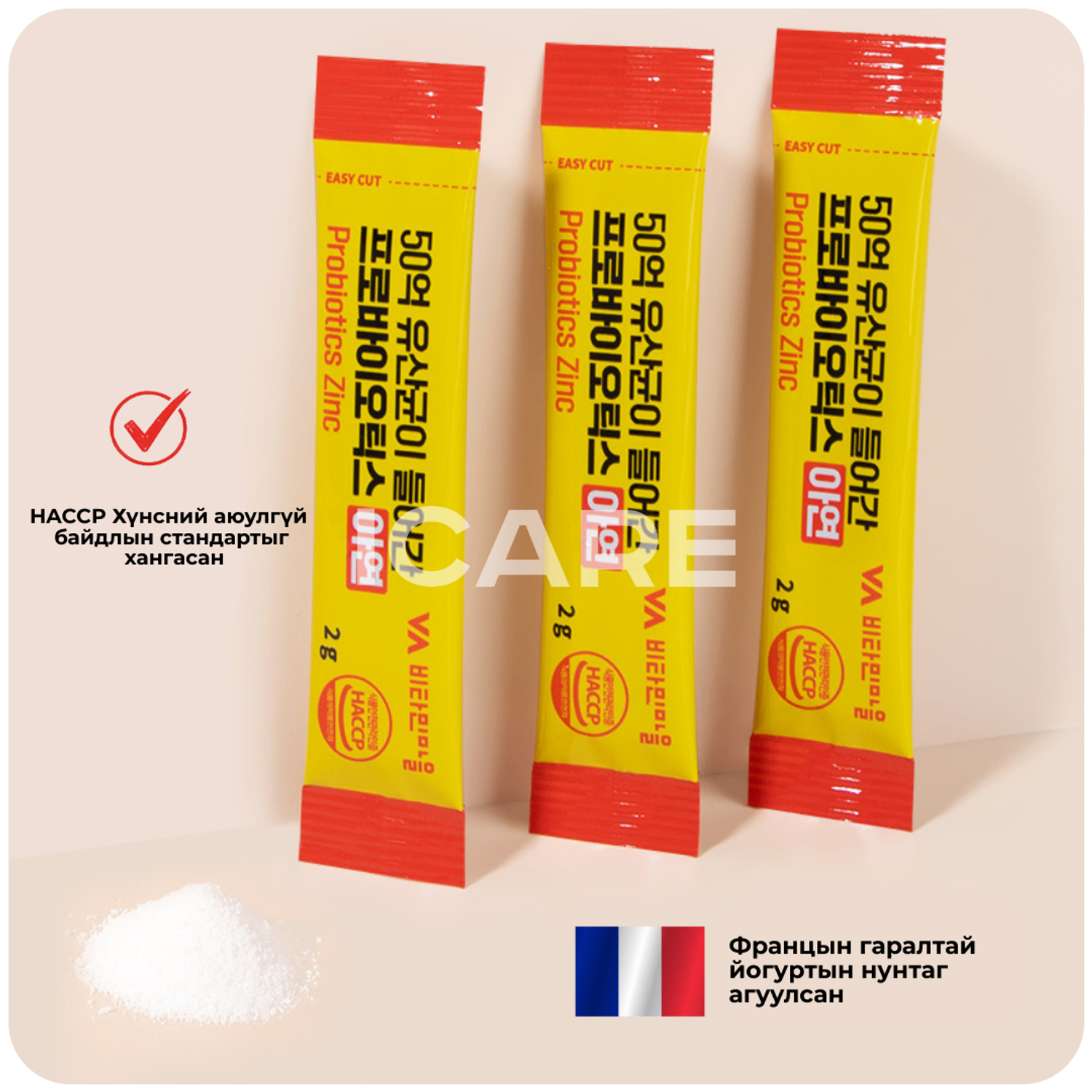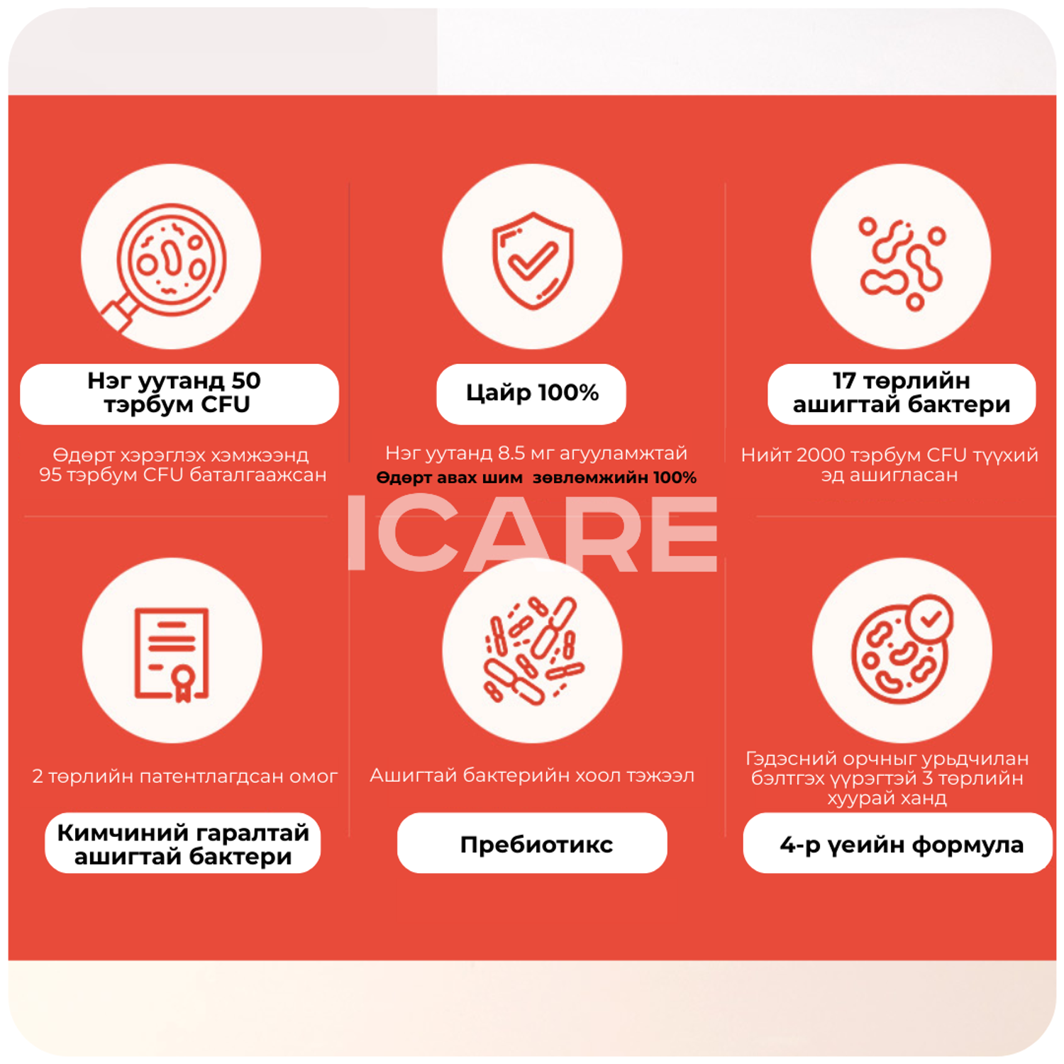 Хамгийн гоё нь ашигтай бактери уухаар эмзэг үйлчилдэг хүмүүст тохирсон гэдэсний орчныг өмнө нь бэлтгэж өгдөг идэвхтэй бодис, ашигтай метаболитийг ялган авч бэлтгэсэн тусгай найрлагатай